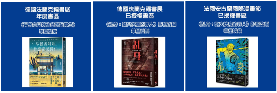 文化內容策進院將於 「2025 德國法蘭克福書展」、「2025 墨西哥瓜達拉哈拉書展」及「2026 法國安古蘭國際漫畫節」設立臺灣館,路邊攤的《早餐店阿姨什麼都記得住》入選了「德國法蘭克福書展」年度書區,星子的《乩身:踏火伏魔的罪人》則同時入選了「德國法蘭克福書展」、「法國安古蘭國際漫畫節」已授權書區,成為代表臺灣的原創著作之一。