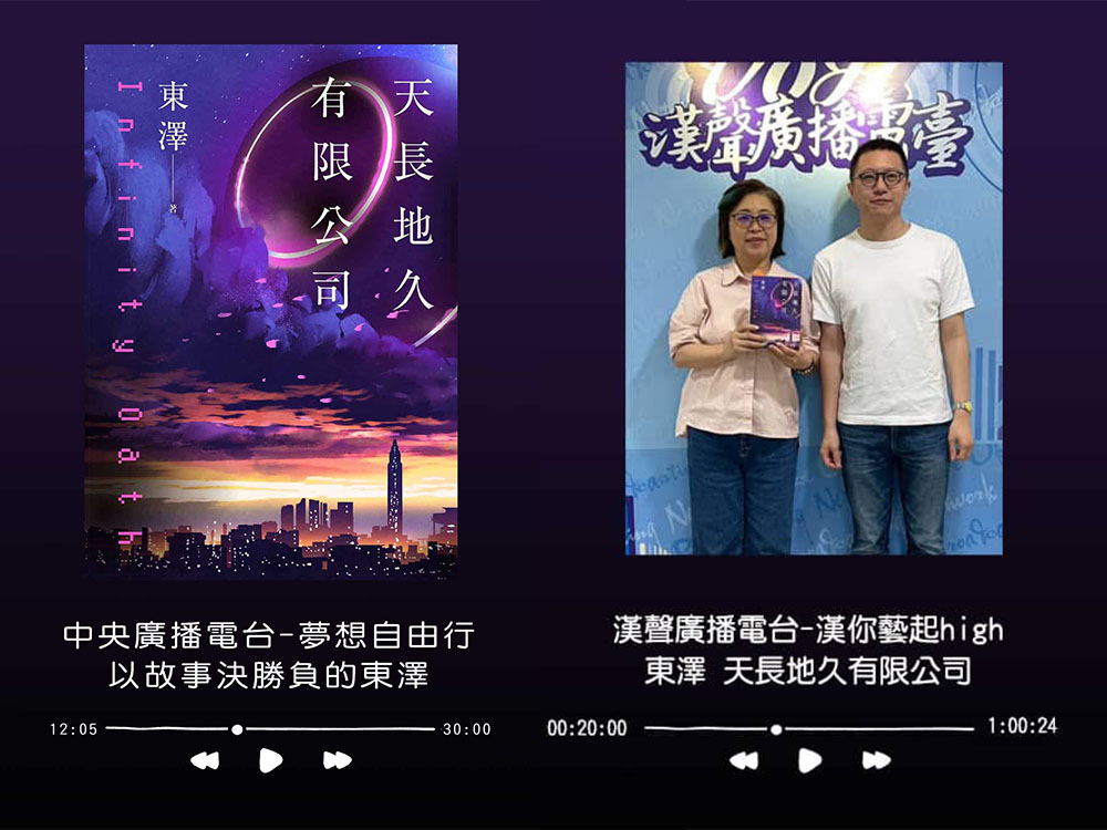 擅長說故事的東澤,新書《天長地久有限公司》的時間感相當耐耐人尋味,中央廣播電台「夢想自由行」,及漢聲廣播電台「漢你藝起high」皆邀請東澤專訪,與主持人暢聊創作的靈感來源,時間、喪屍的主題包裝愛情故事,討論被凝結的時間是最美好的嗎?