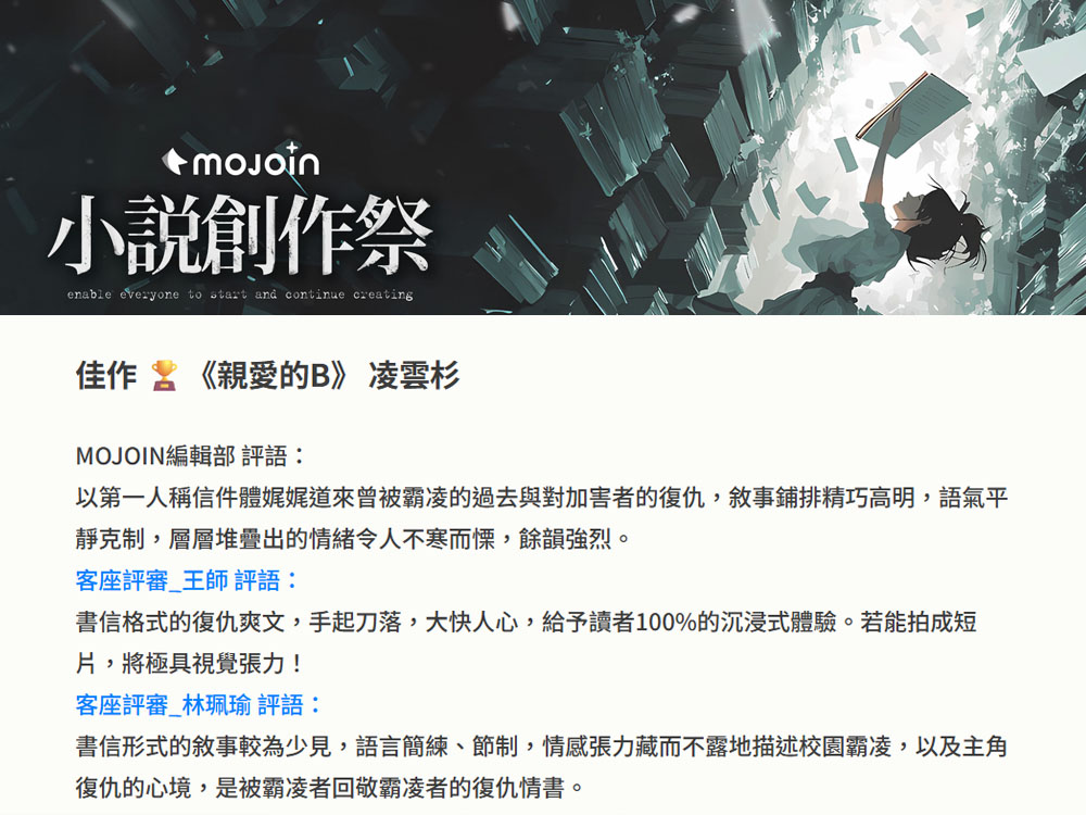 凌雲杉投稿作品《親愛的B》獲得「MOJOIN小說創作祭」佳作!